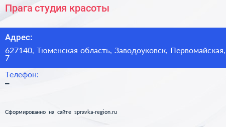 Прага, студия красоты по адресу 627140, Тюменская область, Заводоуковск, Первомайская, 7 в дальнейшем Организация, размещена в следующих категориях: