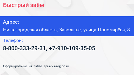 Быстрый заём по адресу Нижегородская область, Заволжье, улица Пономарёва, 8 в дальнейшем Организация, размещена в следующих категориях: