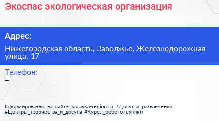 Экоспас, экологическая организация по адресу Нижегородская область, Заволжье, Железнодорожная улица, 17 в дальнейшем Организация, размещена в следующих категориях: