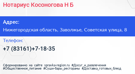 Нотариус Косоногова Н.Б. по адресу Нижегородская область, Заволжье, Советская улица, 8 в дальнейшем Организация, размещена в следующих категориях: