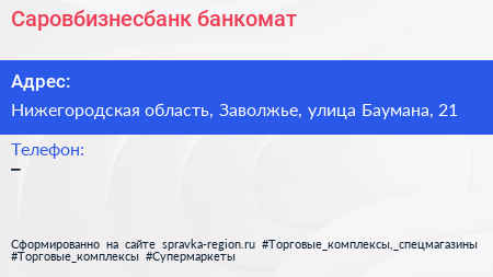 Саровбизнесбанк, банкомат по адресу Нижегородская область, Заволжье, улица Баумана, 21 в дальнейшем Организация, размещена в следующих категориях: