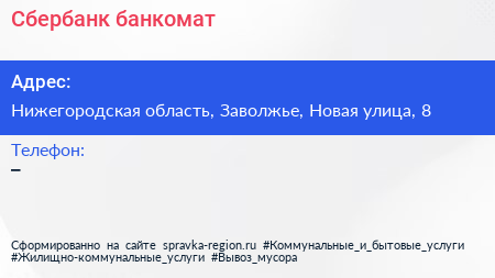 Сбербанк, банкомат по адресу Нижегородская область, Заволжье, Новая улица, 8 в дальнейшем Организация, размещена в следующих категориях: