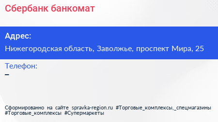 Сбербанк, банкомат по адресу Нижегородская область, Заволжье, проспект Мира, 25 в дальнейшем Организация, размещена в следующих категориях: