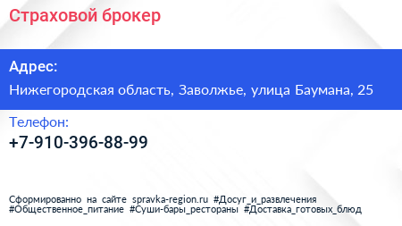 Страховой брокер по адресу Нижегородская область, Заволжье, улица Баумана, 25 в дальнейшем Организация, размещена в следующих категориях: