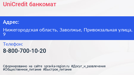 UniCredit, банкомат по адресу Нижегородская область, Заволжье, Привокзальная улица, 9 в дальнейшем Организация, размещена в следующих категориях: