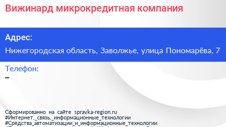Вижинард, микрокредитная компания по адресу Нижегородская область, Заволжье, улица Пономарёва, 7 в дальнейшем Организация, размещена в следующих категориях: