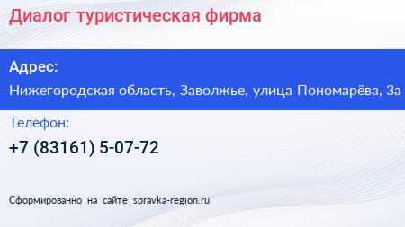Диалог, туристическая фирма по адресу Нижегородская область, Заволжье, улица Пономарёва, 3а в дальнейшем Организация, размещена в следующих категориях: