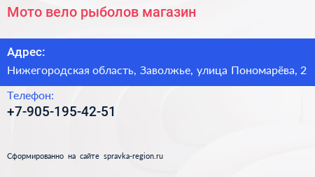 Мото-вело рыболов, магазин по адресу Нижегородская область, Заволжье, улица Пономарёва, 2 в дальнейшем Организация, размещена в следующих категориях: