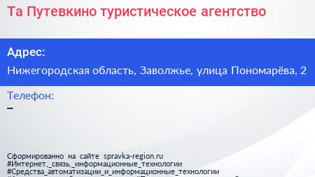 Та Путевкино, туристическое агентство по адресу Нижегородская область, Заволжье, улица Пономарёва, 2 в дальнейшем Организация, размещена в следующих категориях: