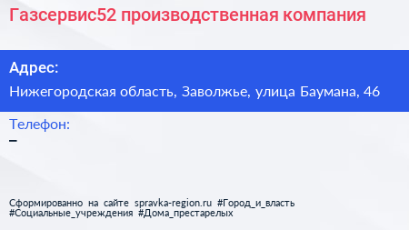 Газсервис52, производственная компания по адресу Нижегородская область, Заволжье, улица Баумана, 46 в дальнейшем Организация, размещена в следующих категориях: