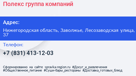 Полекс, группа компаний по адресу Нижегородская область, Заволжье, Лесозаводская улица, 37 в дальнейшем Организация, размещена в следующих категориях: