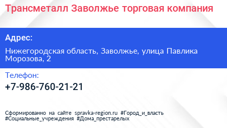 Трансметалл-Заволжье, торговая компания по адресу Нижегородская область, Заволжье, улица Павлика Морозова, 2 в дальнейшем Организация, размещена в следующих категориях: