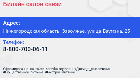 Билайн, салон связи по адресу Нижегородская область, Заволжье, улица Баумана, 25 в дальнейшем Организация, размещена в следующих категориях: