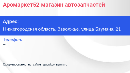 Аромаркет52, магазин автозапчастей по адресу Нижегородская область, Заволжье, улица Баумана, 21 в дальнейшем Организация, размещена в следующих категориях: