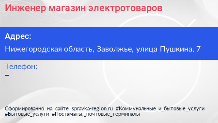 Инженер, магазин электротоваров по адресу Нижегородская область, Заволжье, улица Пушкина, 7 в дальнейшем Организация, размещена в следующих категориях: