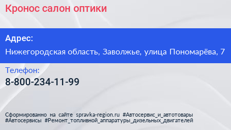 Кронос, салон оптики по адресу Нижегородская область, Заволжье, улица Пономарёва, 7 в дальнейшем Организация, размещена в следующих категориях: