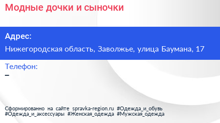 Модные дочки и сыночки по адресу Нижегородская область, Заволжье, улица Баумана, 17 в дальнейшем Организация, размещена в следующих категориях: