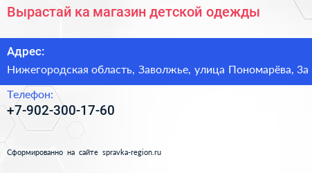 Вырастай-ка, магазин детской одежды по адресу Нижегородская область, Заволжье, улица Пономарёва, 3а в дальнейшем Организация, размещена в следующих категориях: