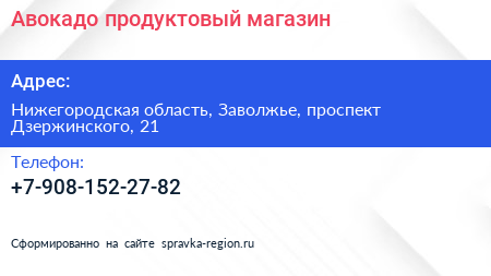 Авокадо, продуктовый магазин по адресу Нижегородская область, Заволжье, проспект Дзержинского, 21 в дальнейшем Организация, размещена в следующих категориях:
