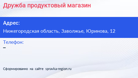 Дружба, продуктовый магазин по адресу Нижегородская область, Заволжье, Юринова, 12 в дальнейшем Организация, размещена в следующих категориях: