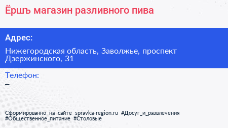 Ёршъ, магазин разливного пива по адресу Нижегородская область, Заволжье, проспект Дзержинского, 31 в дальнейшем Организация, размещена в следующих категориях: