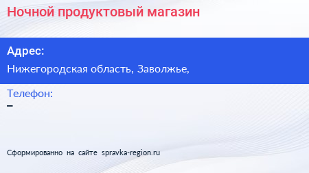 Ночной, продуктовый магазин по адресу Нижегородская область, Заволжье, в дальнейшем Организация, размещена в следующих категориях: