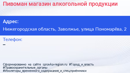 Пивоман, магазин алкогольной продукции по адресу Нижегородская область, Заволжье, улица Пономарёва, 2 в дальнейшем Организация, размещена в следующих категориях: