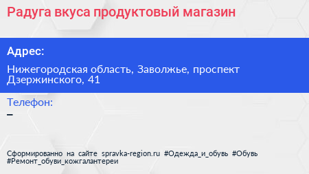 Радуга вкуса, продуктовый магазин по адресу Нижегородская область, Заволжье, проспект Дзержинского, 41 в дальнейшем Организация, размещена в следующих категориях: