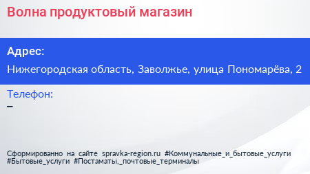 Волна, продуктовый магазин по адресу Нижегородская область, Заволжье, улица Пономарёва, 2 в дальнейшем Организация, размещена в следующих категориях: