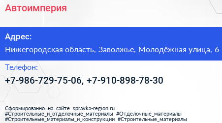 Автоимперия по адресу Нижегородская область, Заволжье, Молодёжная улица, 6 в дальнейшем Организация, размещена в следующих категориях: