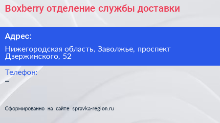 Boxberry, отделение службы доставки по адресу Нижегородская область, Заволжье, проспект Дзержинского, 52 в дальнейшем Организация, размещена в следующих категориях: