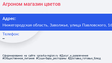 Агроном, магазин цветов по адресу Нижегородская область, Заволжье, улица Павловского, 16 в дальнейшем Организация, размещена в следующих категориях: