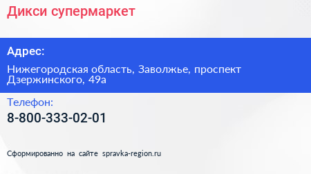 Дикси, супермаркет по адресу Нижегородская область, Заволжье, проспект Дзержинского, 49а в дальнейшем Организация, размещена в следующих категориях: