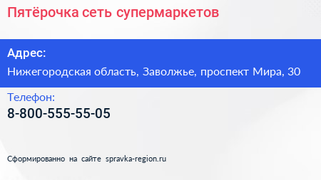 Пятёрочка, сеть супермаркетов по адресу Нижегородская область, Заволжье, проспект Мира, 30 в дальнейшем Организация, размещена в следующих категориях: