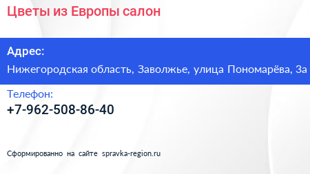 Цветы из Европы, салон по адресу Нижегородская область, Заволжье, улица Пономарёва, 3а в дальнейшем Организация, размещена в следующих категориях: