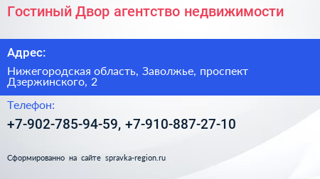 Гостиный Двор, агентство недвижимости по адресу Нижегородская область, Заволжье, проспект Дзержинского, 2 в дальнейшем Организация, размещена в следующих категориях: