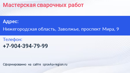 Мастерская сварочных работ по адресу Нижегородская область, Заволжье, проспект Мира, 9 в дальнейшем Организация, размещена в следующих категориях: