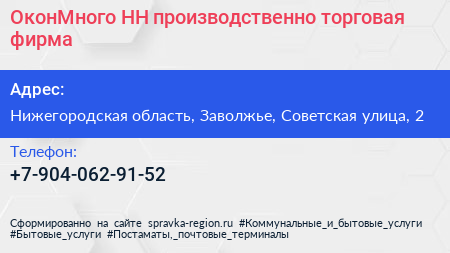 ОконМного НН, производственно-торговая фирма по адресу Нижегородская область, Заволжье, Советская улица, 2 в дальнейшем Организация, размещена в следующих категориях: