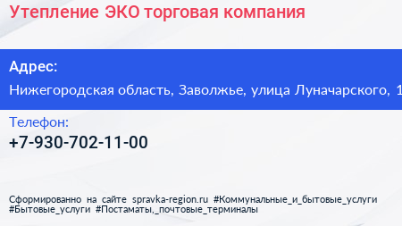 Утепление ЭКО, торговая компания по адресу Нижегородская область, Заволжье, улица Луначарского, 1 в дальнейшем Организация, размещена в следующих категориях: