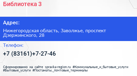 Библиотека №3 по адресу Нижегородская область, Заволжье, проспект Дзержинского, 28 в дальнейшем Организация, размещена в следующих категориях:
