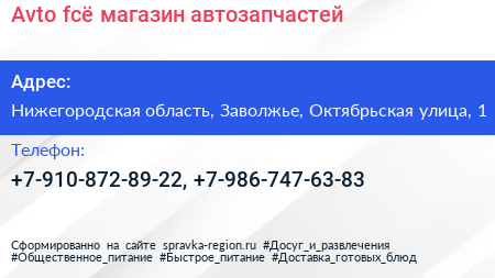 Avto-fcё, магазин автозапчастей по адресу Нижегородская область, Заволжье, Октябрьская улица, 1 в дальнейшем Организация, размещена в следующих категориях: