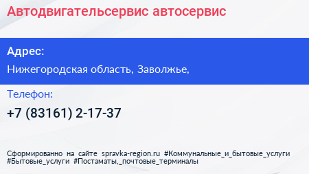 Автодвигательсервис, автосервис по адресу Нижегородская область, Заволжье, в дальнейшем Организация, размещена в следующих категориях: