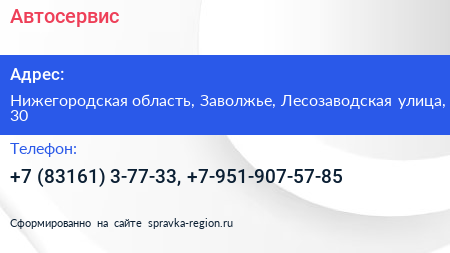 Автосервис по адресу Нижегородская область, Заволжье, Лесозаводская улица, 30 в дальнейшем Организация, размещена в следующих категориях: