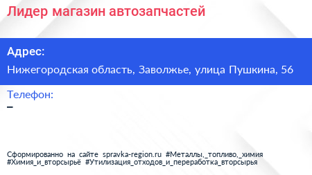 Лидер, магазин автозапчастей по адресу Нижегородская область, Заволжье, улица Пушкина, 56 в дальнейшем Организация, размещена в следующих категориях: