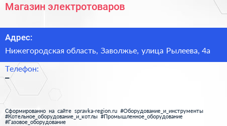 Магазин электротоваров по адресу Нижегородская область, Заволжье, улица Рылеева, 4а в дальнейшем Организация, размещена в следующих категориях: