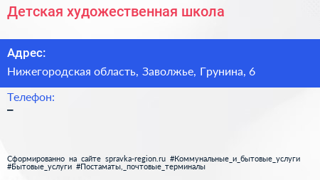 Детская художественная школа по адресу Нижегородская область, Заволжье, Грунина, 6 в дальнейшем Организация, размещена в следующих категориях: