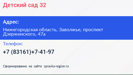Детский сад №32 по адресу Нижегородская область, Заволжье, проспект Дзержинского, 47а в дальнейшем Организация, размещена в следующих категориях: