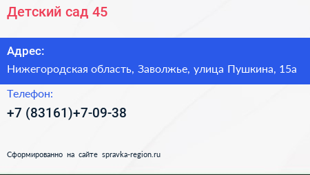 Детский сад №45 по адресу Нижегородская область, Заволжье, улица Пушкина, 15а в дальнейшем Организация, размещена в следующих категориях: