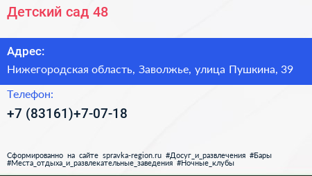 Детский сад №48 по адресу Нижегородская область, Заволжье, улица Пушкина, 39 в дальнейшем Организация, размещена в следующих категориях: