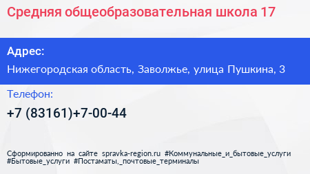 Средняя общеобразовательная школа №17 по адресу Нижегородская область, Заволжье, улица Пушкина, 3 в дальнейшем Организация, размещена в следующих категориях: